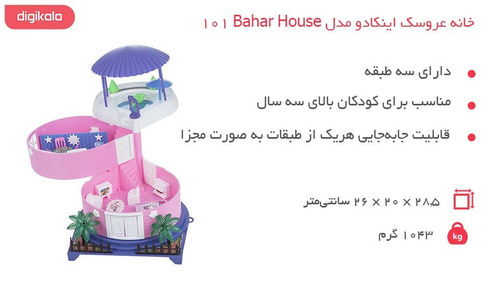 بچهها، دوست دارید که یک خانهی عروسکی برای عروسکهایتان داشته باشید؟ «خانهی عروسک اینکادو مدل Bahar House 101» در سه طبقه برای شما طراحی شده است تا با آن بازی کنید و حسابی سرگرم شوید. هر طبقهی این اسباببازی کاملاً مجزاست و میتوانید آن را حرکت دهید. این اسباببازی تکههای کوچک و بامزهای دارد که آن را بسیار جذاب کرده است. در اتاق نشیمن 28.5سانتیمتری یک نیمست مبل راحتی به همراه میز وسط وجود دارد. در قسمتی دیگر از این طبقه، سرویس خواب به همراه آباژور و یک بخاری کوچک برای عروسکتان طراحی شده است. برای ورود به طبقهی دوم میتوانید آن را به سمت جلو بکشید و وارد آن شوید. در این طبقه آشپزخانه و سرویس بهداشتی وجود دارد. یک گاز و سرویس ناهارخوری به همراه یخچال سایدبایساید منتظر شماست. در قسمتی دیگر هم یک وان 5سانتیمتری به همراه توالت فرنگی طراحی شده است. اینک وارد طبقهی سوم این خانهی عروسکی شوید. در طبقهی سوم، عروسک شما میتواند در استخر شنا کرده یا در کنار استخر در صندلی راحتی به ابعاد 2.5 × 2.5 × 4.5 سانتیمتر بنشیند و استراحت کند. این مجموعه با وجود تکههای ریز و کوچکش باید از دسترس کودکان زیر سه سال دور باشد. مدل Bahar House 101 را از دیجیکالا برای فرزند دلبندتان خریداری کرده و حسابی او را ذوقزده کنید.