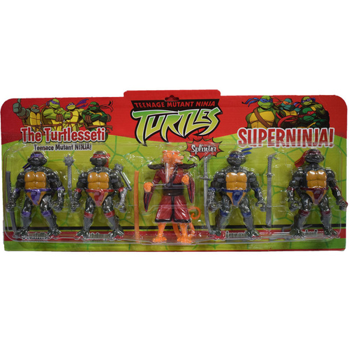 این بسته شامل 5 عدد فیگور لاک پشت های نینجا میباشد که همگی دارای دست و پای متحرک هستند همچنین شامل ابزارهایی چون شمشیر ، گرز و ... میباشد جنس این فیگور ها پلاستیک سخت میباشد که قابل شست و شو است